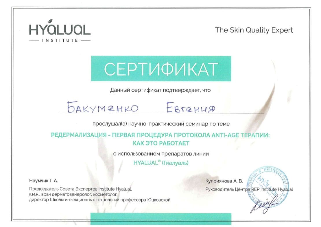 Имею высшее медицинское образование врача дерматовенеролога и косметолога и 15-летнюю медицинскую практику. Все мои услуги аккредитованы и сертифицированы ежегодными подтверждениями квалификации